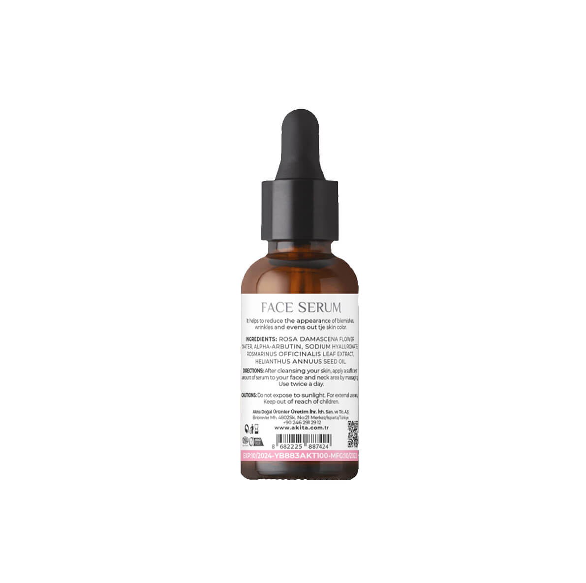 Akita's Natural Anti-Spot & Anti-Aging Face Serum is an exquisite blend of nature's finest ingredients, meticulously designed to rejuvenate and brighten your skin. This serum features Rosa Damascena Flower Water, known for its hydrating and soothing properties, creating a base that pampers your skin. Alpha Arbutin is a key ingredient that works tirelessly to reduce the appearance of dark spots and even out skin tone, making your skin appear more radiant.